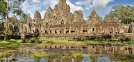 The fortified city of ANGKOR THOM covers an area of 10 square km. Enclosed by a wall and wide moats, the city includes many of Angkor's most popular sights. Enter by the monumental SOUTH GATE over a causeway lined on either side by statues of demons and gods, each carrying a giant naga. Continue to the TERRACE OF THE ELEPHANTS and the TERRACE OF THE LEPER KINGS, former spaces for public cermonies, both adorned with dramatic bas reliefs. Visit the ruined BAPHUON, ROYAL ENCLOSURE and PHIMEANAKAS before continuing to the mysterious BAYON TEMPLE. In this temple, one of the most popular and compelling in Angkor, explore the galleries of beautifully preserved bas reliefs and ascend narrow stairs to reach the central sanctuary, where you will find giant stone faces smiling enigmatically down at you from every angle.